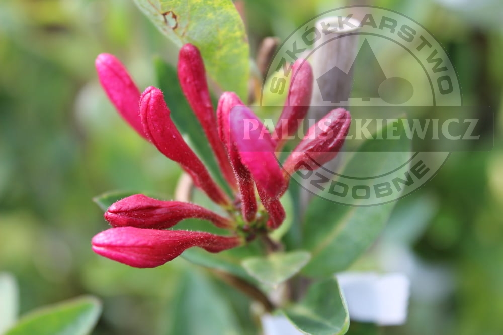 Pnącze o rurkowatych, fioletowoczerwonych na zewnątrz i beżowych wewnątrz kwiatach.